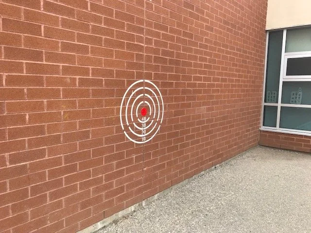 Wall Target Toss is designed for two or more players. Everyone takes turns bouncing the ball off the ground and aiming for the wall target, or the player who retrieves the ball after it bounces off the target gets to throw next.